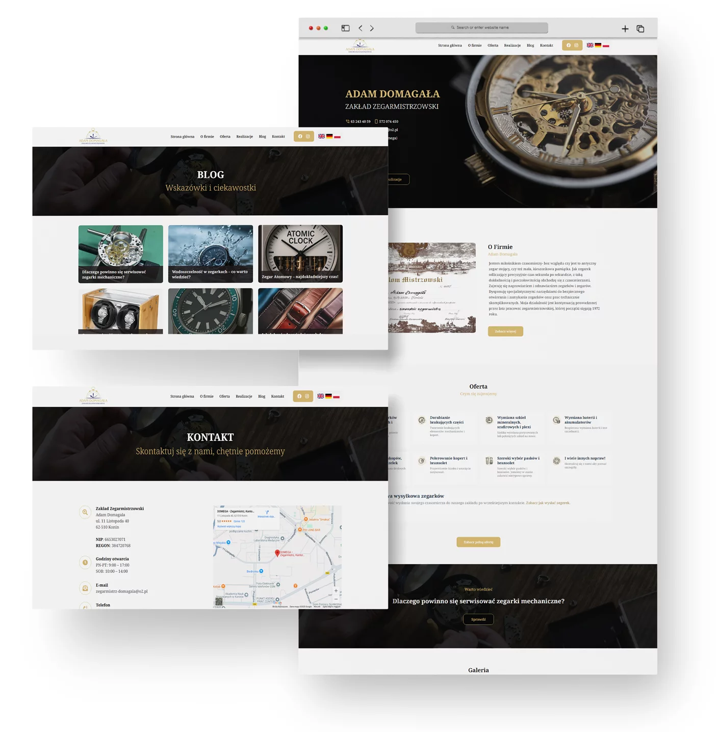 Projekt strony internetowej dla zegarmistrza Adama Domagały z Konina – specjalisty z wieloletnim doświadczeniem w naprawie i konserwacji zegarków. Głównym celem strony jest ułatwienie kontaktu z klientami, budowanie silnej, lokalnej marki oraz zaprezentowanie zakresu usług i dotychczasowych realizacji.